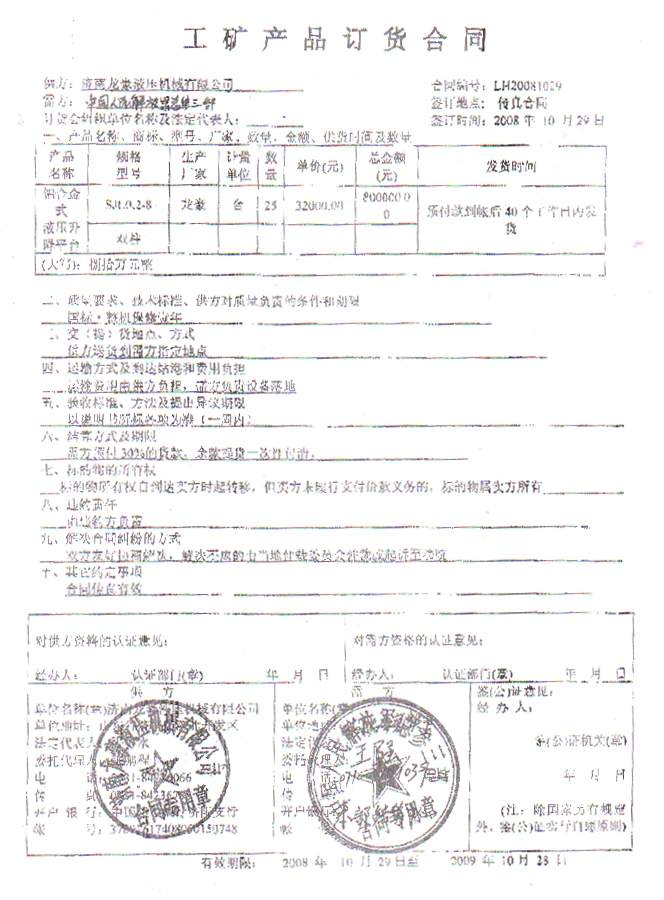 2008年10月28日中國人民解放軍總參三部物資處3名解放軍干部來我公司實地考察??疾毂容^后對我公司的規(guī)模和產品給予了極大的肯定,并就一直聯(lián)系的要購買的25臺鋁合金升降機簽訂了訂貨合同?,F(xiàn)我公司已按照約定如期交貨,總參三部驗收后非常滿意,并已全部付款到位。